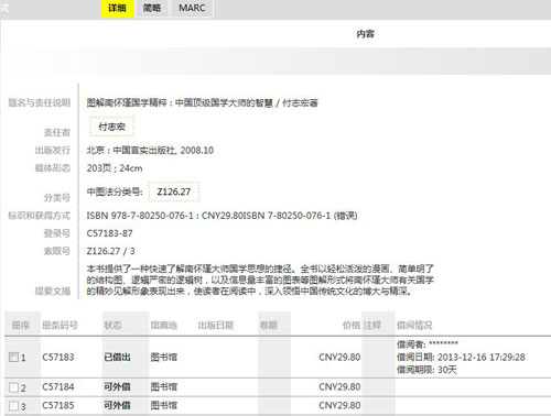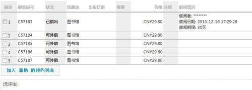 出现该书的详细信息后,在册序中勾选需要预约的书 (只有借阅情况有读者信息的书才能预约)。