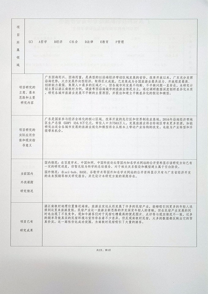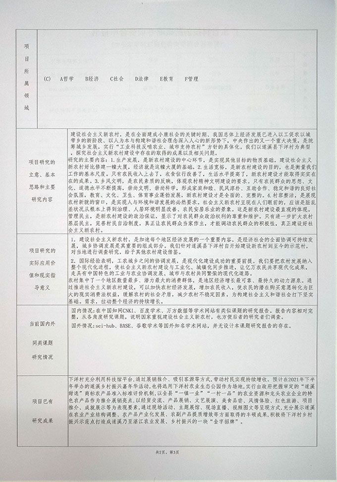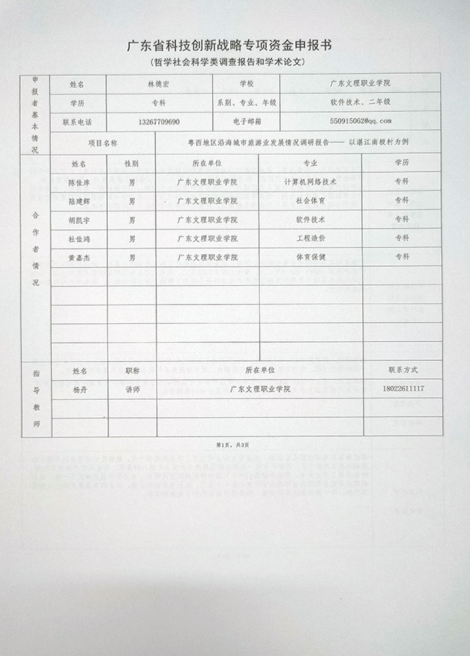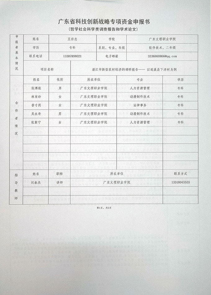 按照团省委、省学联《关于开展2023年度广东省科技创新战略专项资金(大学生科技创新培育)项目申报的通知》的有关精神及工作安排,校团委组织开展公开答辩,根据评审专家评审结果和意见,推荐《湛江市新型农村经济的调研报告——以遂溪县下洋村为例》、《粤西地区沿海城市旅游业发展情况调研报告——以湛江南极村为例》2个作品(其中一般项目1个,候选项目1个)申报2023年度广东省“攀登计划”专项资金。