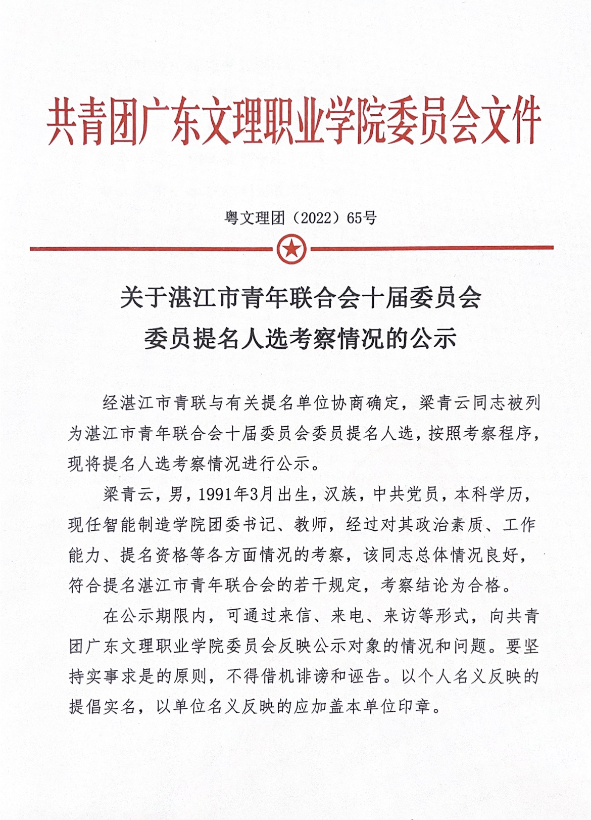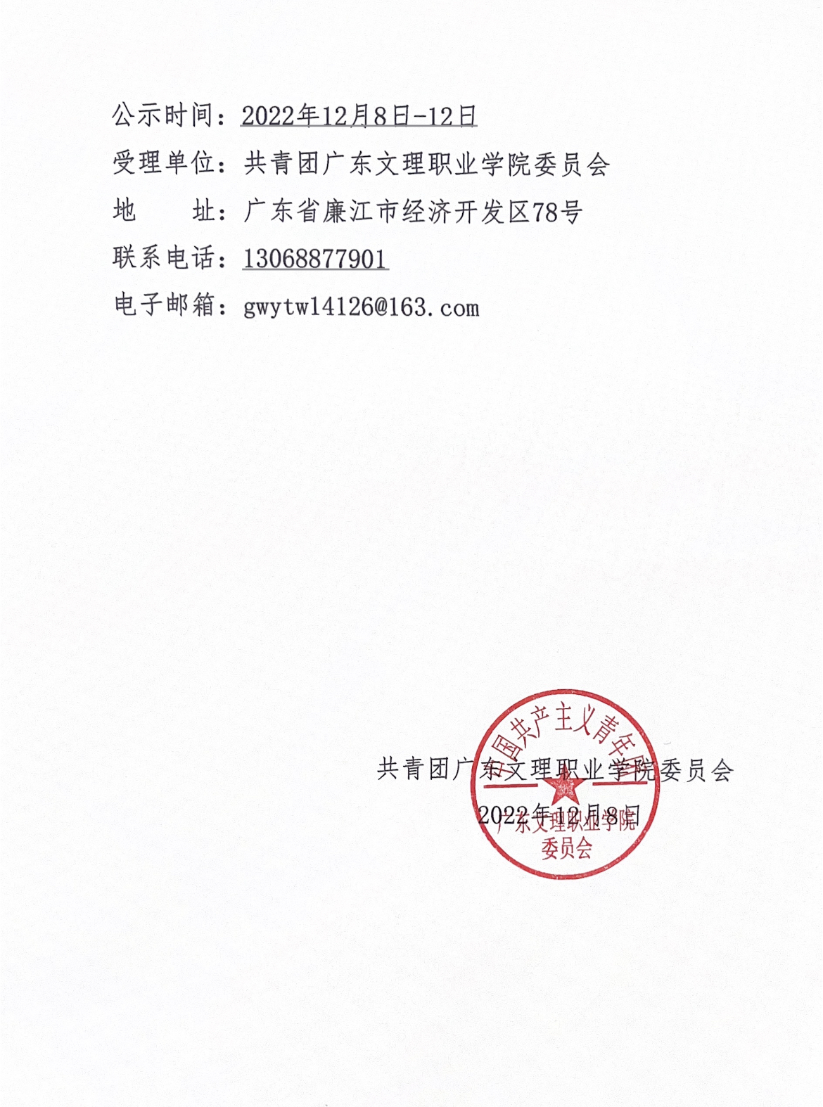 - 关于确定广东文理职业学院出席共青团湛江市第十四次代表大会代表人选的公示 [10/03/2022]