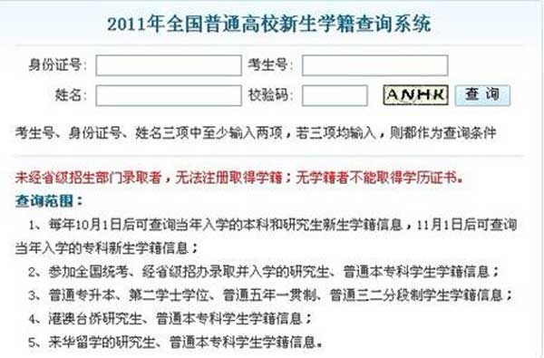 1.查询方法:登录 “全国普通高校新生学籍查询系统”( http://xjxl.chsi.com.cn/xscx.do),输入考生号、身份证号、姓名三项中至少两项及校验码(如图1),可查询本人的学籍信息,包含姓名、院校名称、专业名称、学籍状态(如图2)。