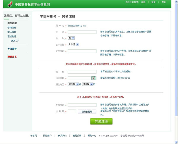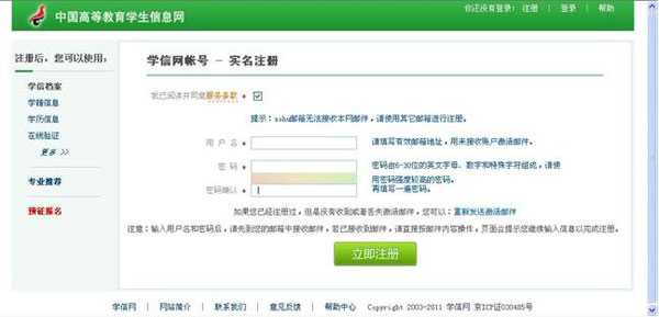 ①填写姓名时不能出现错别字,与学籍信息中的姓名不匹配时虽能注册成功但无法查询到学籍信息;