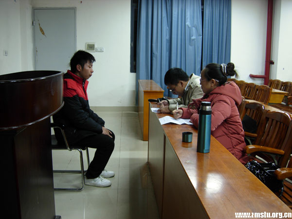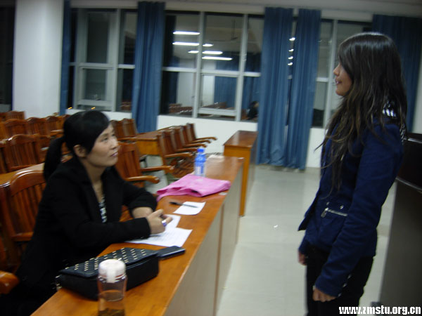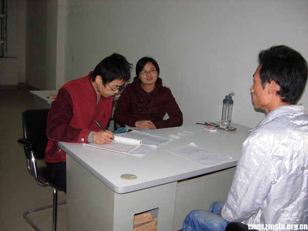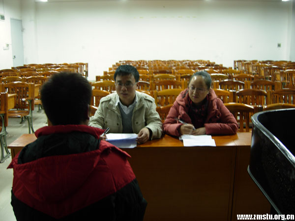 在英语系办公室进行面试的系秘书王利民(左)以及专业教师肖霞