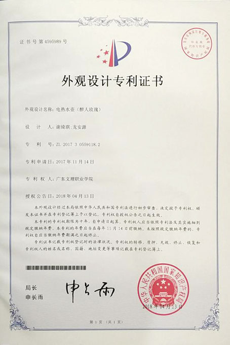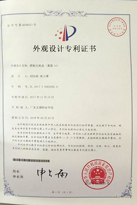 近日,学院科研工作又获喜讯,艺术传媒系教师黄小珊、龙安源指导学生胡钰祯、谢琦琪等完成的“酒瓶包装盒(桑葚14)(专利号ZL201730562454.2)”“电热水壶(醉人玫瑰)(专利号ZL201730559118.2)”等52件作品获得中华人民共和国国家知识产权局颁发的外观设计专利证书。这些专利大部分是“2017年富田杯工业设计大赛”作品,其中黄小珊指导完成的专利作品39件,龙安源指导完成的专利作品13件。