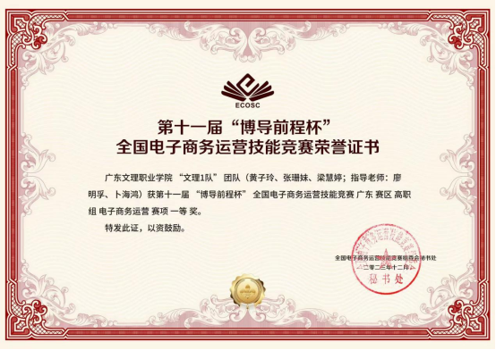 广东文理职业学院“文理1队”团队:黄子玲、张珊妹、梁慧婷;指导老师:廖明孚、卜海鸿。荣获第十一届“博导前程杯”全国电子商务运营技能竞赛广东 赛区高职组“电子商务运营”赛项一等奖,名列第二,晋级全国总决赛。