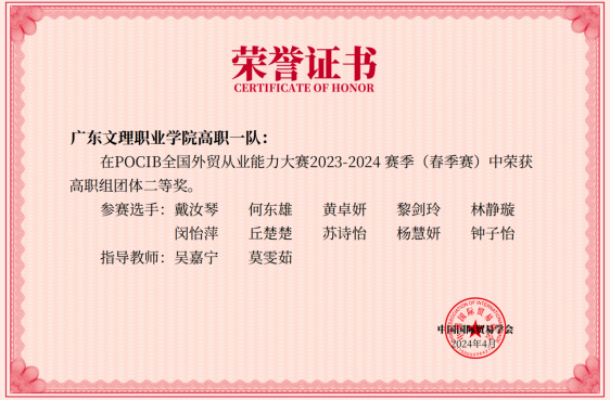 我校学子收获颇丰,在团体赛中,由来自国际经济与贸易和跨境电子商务专业的苏诗怡、戴汝琴、何东雄、黄卓妍、黎剑玲、林静璇、闵怡萍、丘楚楚、杨慧妍、钟子怡同学(指导教师:吴嘉宁、莫雯茹)组成的队伍在POCIB全国外贸从业能力大赛2023-2024 赛季(春季赛)中荣获高职组团体二等奖。