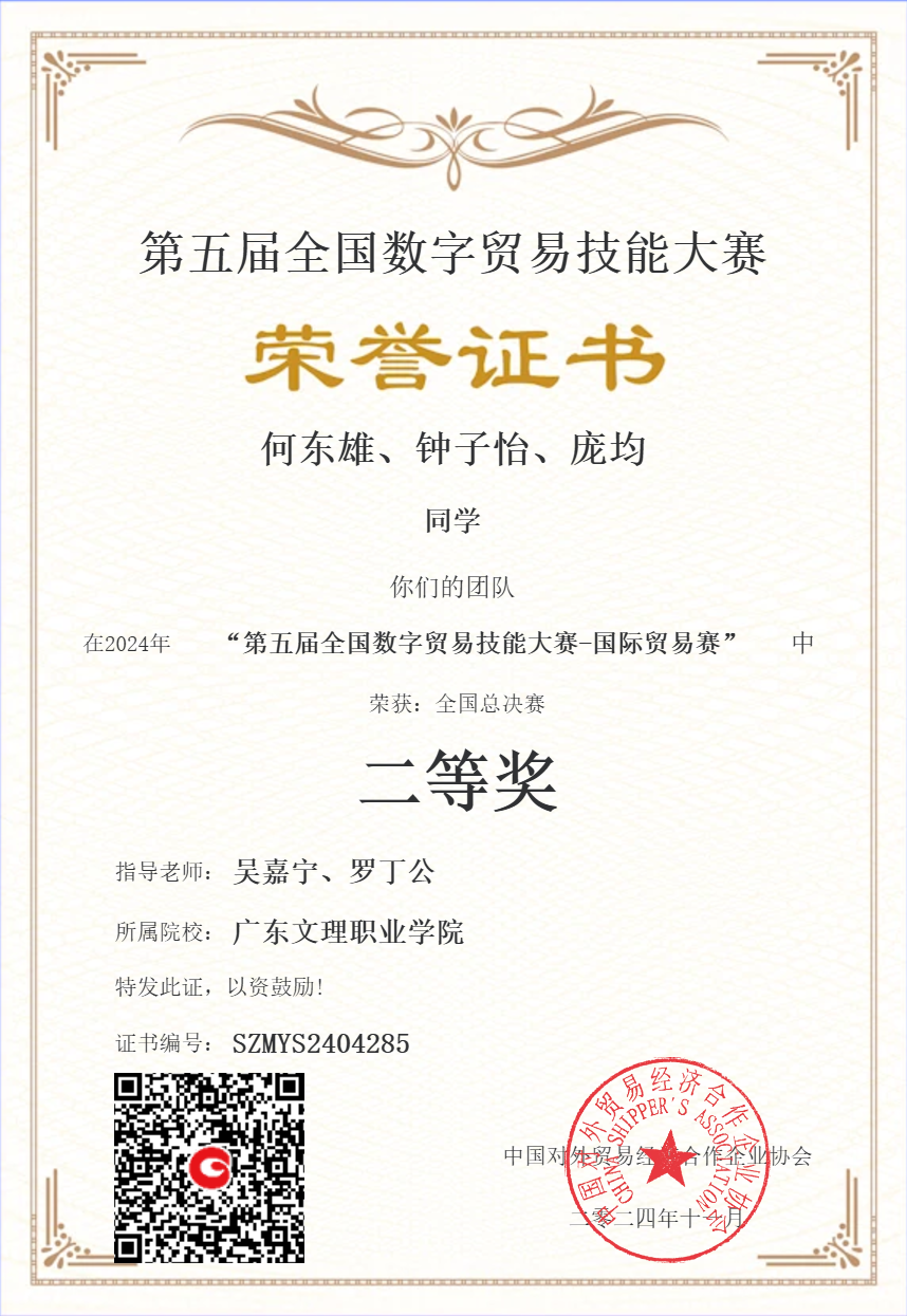 第五届全国数字贸易技能大赛-国际贸易赛落下帷幕,23级国际经济与贸易专业闵怡萍、张畅、陈安彬小组,23级国际经济与贸易专业何东雄、钟子怡联合22级跨境电商专业庞均,两组学生凭借扎实的理论基础、出色的实践能力和创新的解决方案,最终荣获两个二等奖。