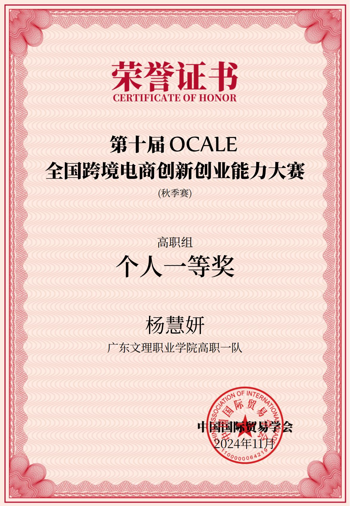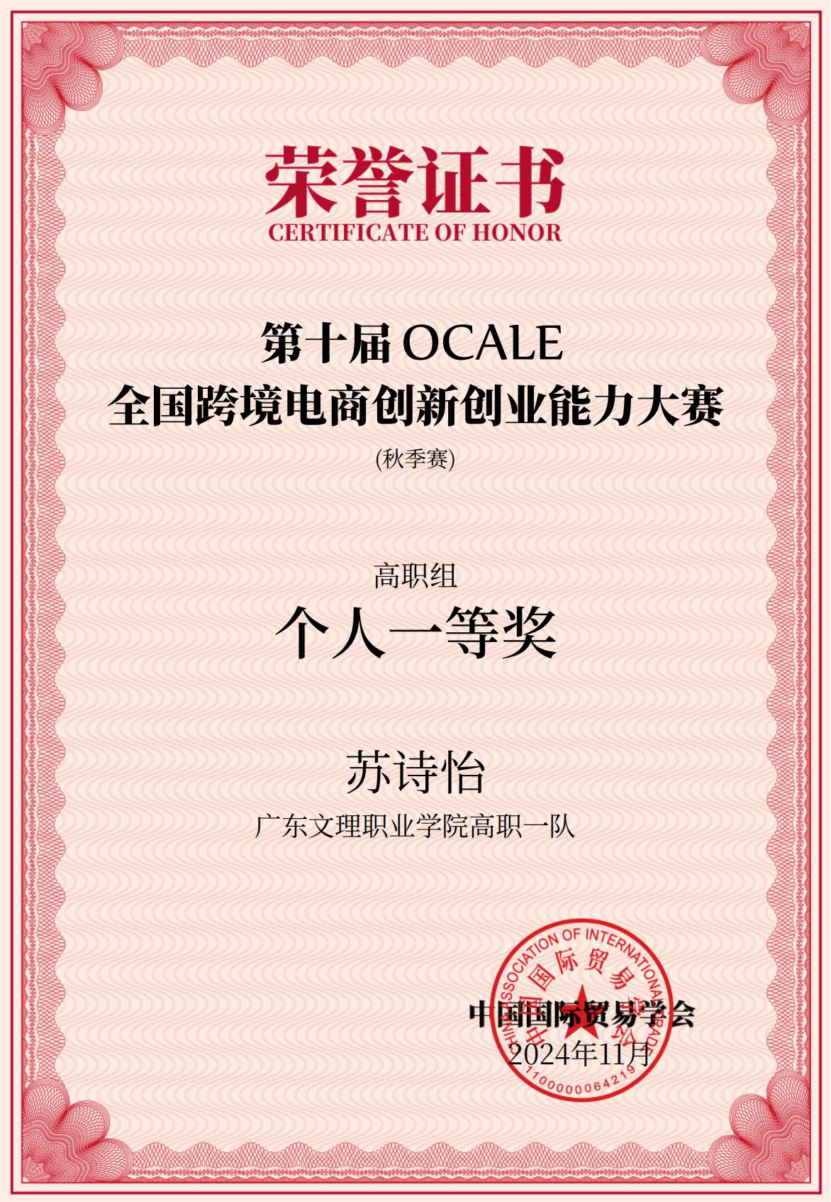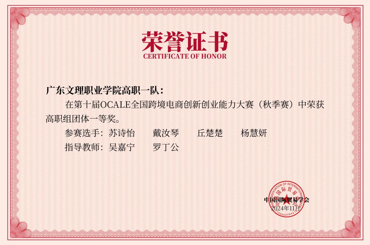 近日,22级国际经济与贸易专业苏诗怡、戴汝琴、杨慧妍、丘楚楚四位同学参加第十届OCALE全国跨境电商创新创业能力大赛秋季赛,经过为期3天的激烈角逐,最终荣获高职组团体一等奖,四个个人一等奖。