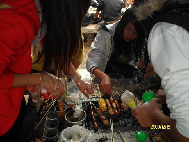 在这里,同学们暂时忘记了一路奔波的疲劳,亲身感受大自然所带给我们的美妙,尽情的玩耍着。中午时分,大家拿着准备好的烧烤材料,开始了丰富的“午餐”。在烧烤之余,同学们谈笑风生,忘记了生活中的烦恼,尽情的享受着这一天的惬意。当品尝着自己亲手烧出来的食物时,虽然烧焦近乎成了黑炭,但是同学们吃起来心里却是满足的,脸上挂着幸福的笑容……