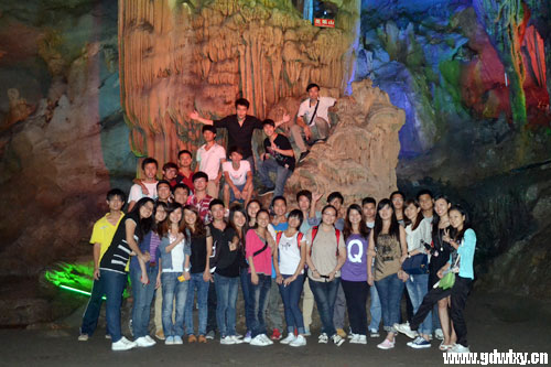 秋风萧瑟,丹桂飘香。10月27日早上七点多,同学们带着激动的心情在学校门口集合。在班委的组织下,乘坐包车,一路欢声笑语。十一点多到达目的地——广西玉林(勾漏洞)。勾漏洞历代屡有修缮,明建“绦尘亭”。清改建“碧虚亭”,增建雄伟的“葛仙祠”。民国期间建“桃源亭”、“白沙亭”、道观、花园、广场和环山马路。解放后多次修缮,扩充勾漏洞风景区。