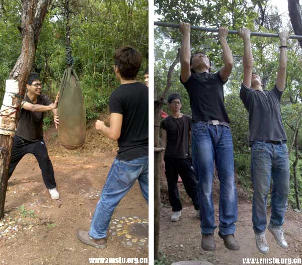 山上有些附近民众自行搭建的简便运动娱乐设施,如沙包、单杠、吊环、秋千等,我们也来试试。