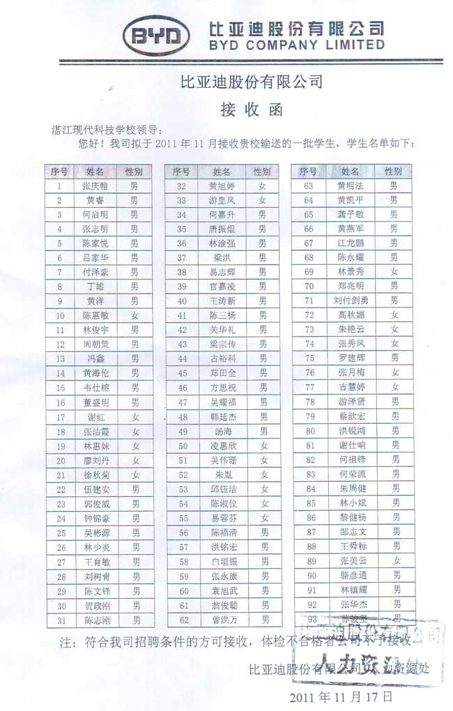 比亚迪股份有限公司录用名单
