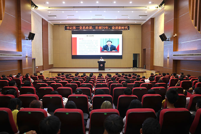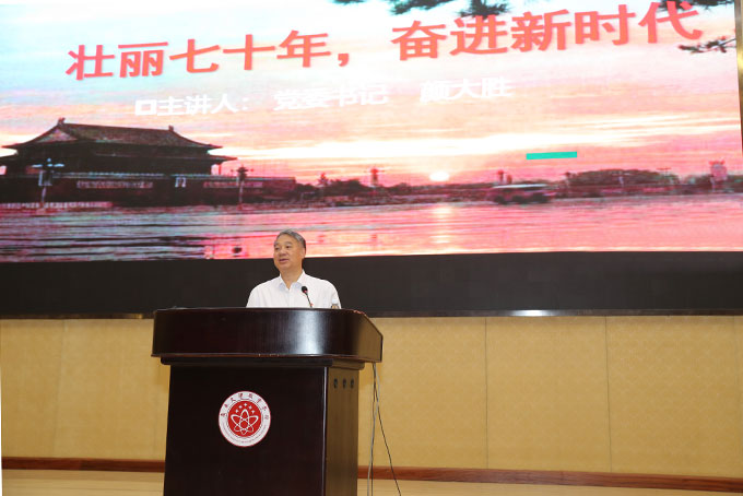 1016日晚上,学院党委书记颜大胜在学术报告厅以《壮丽七十年,奋进新时代》为题给2019级新生上第一堂思政课。