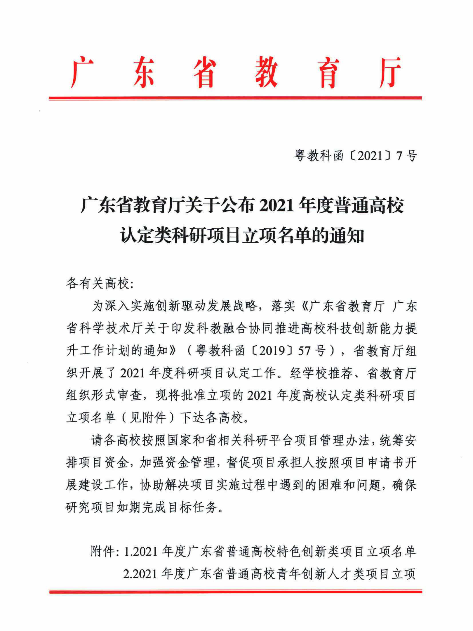 近日,广东省教育厅公布了2021年度普通高校认定类科研项目立项名单,我校6个项目赫然在列。我校幸理等4位教师获广东省普通高校特色创新类项目立项,李新蕾等2位教师获得广东省普通高校青年创新人才类项目立项。