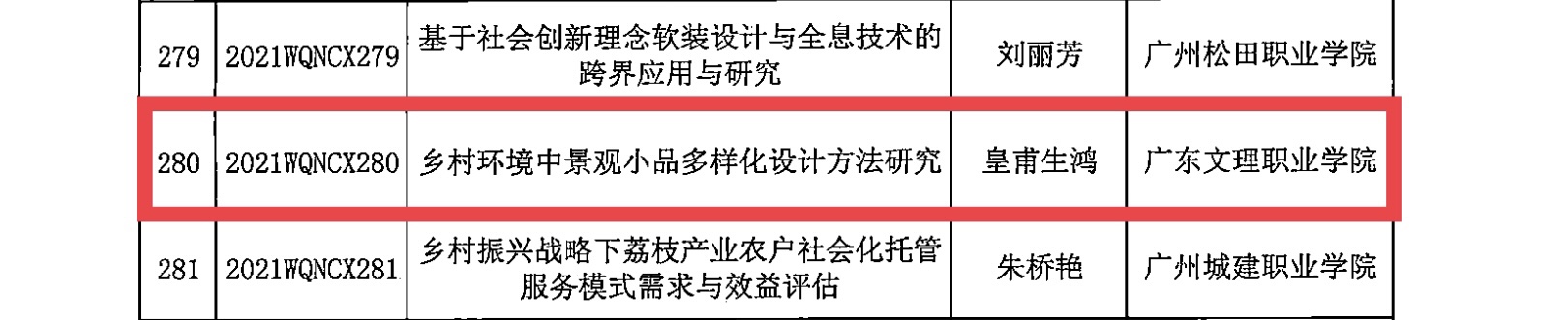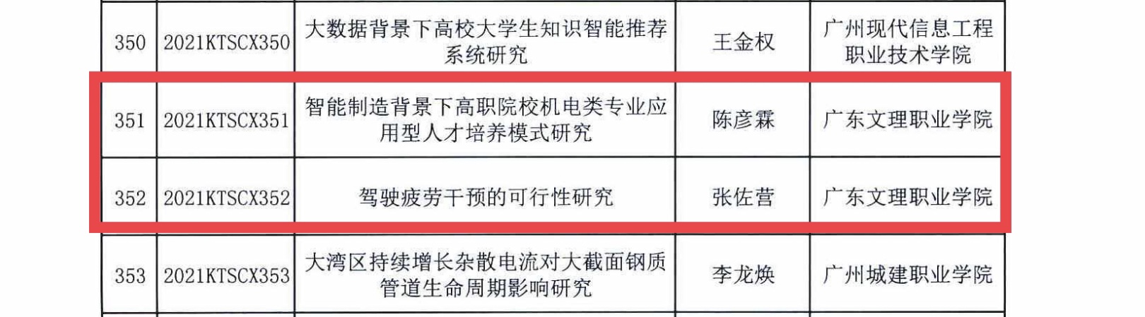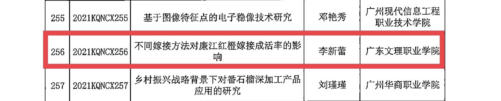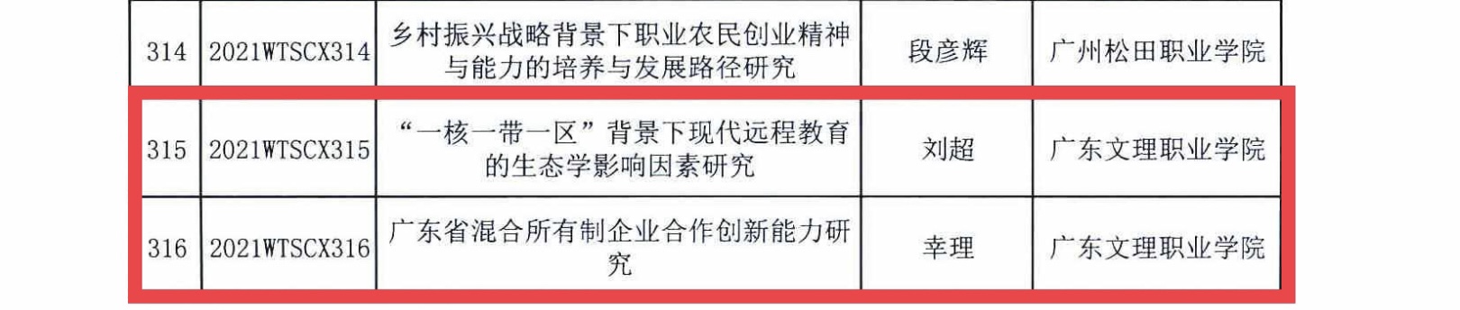 幸理老师课题是《广东省混合所有制企业合作创新能力研究》(2021WTSCX316),陈彦霖老师课题是《智能制造背景下高职院校机电类专业应用型人才培养模式研究》(2021KTSCX351),张佐营老师课题是《驾驶疲劳干预的可行性研究》(2021KTSCX352),刘超老师课题是《“一核一带一区”背景下现代远程教育的生态学影响因数研究》(2021WTSCX315)。李新蕾老师课题是《不同嫁接方法对廉江红橙嫁接成活率的影响》(2021KQNCX256),皇甫生鸿老师课题是《乡村环境中景观小品多样化设计方法研究》(2021WQNCX280)。
