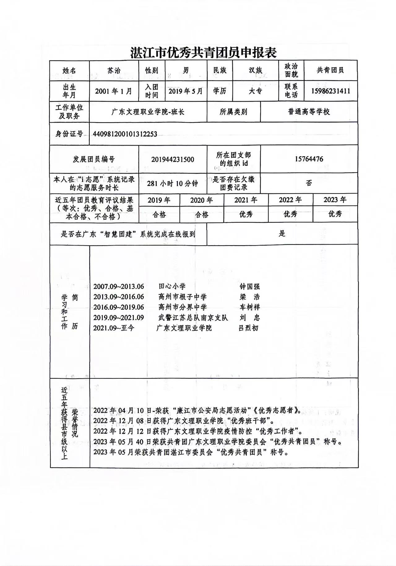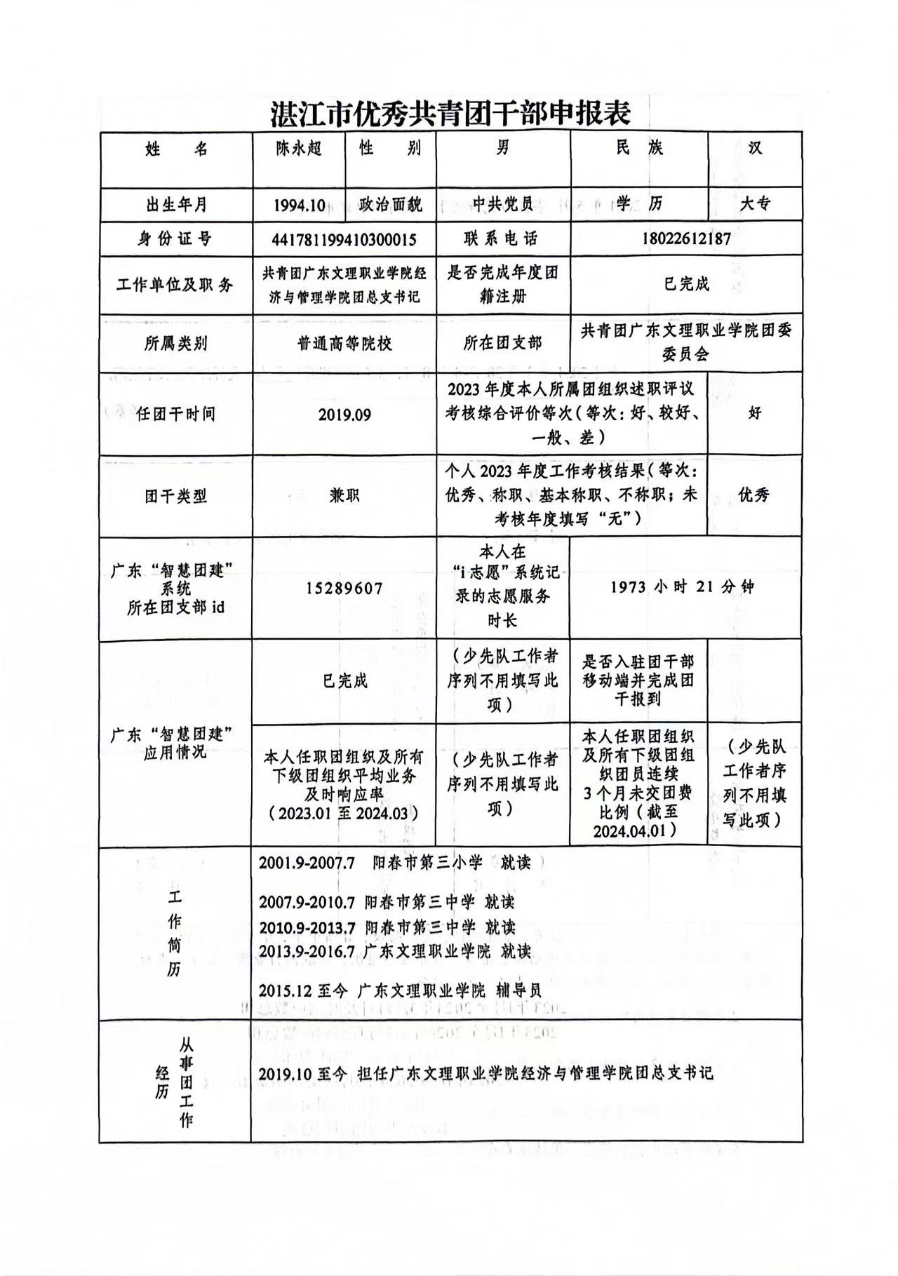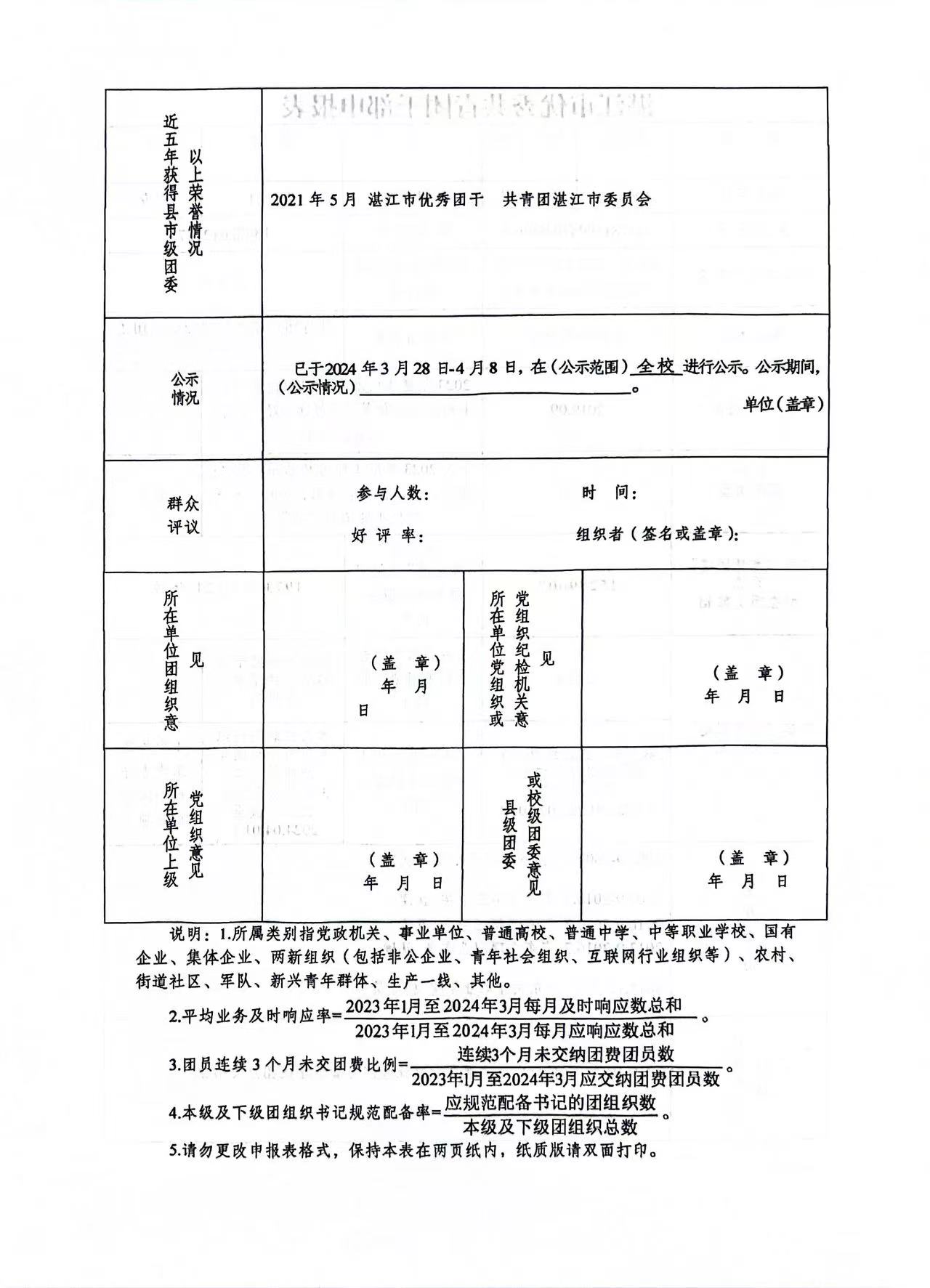 为表彰先进,树立典型,根据团市委关于开展2023—2024年度湛江市五四红旗团(工)委、五四红旗团(总)支部、优秀共青团员、优秀共青团干部的表彰工作通知,经过学院团委研究,决定拟推荐以下单位和个人申报湛江市五四红旗团(工)委、优秀共青团员、优秀共青团干部,现将有关事项公示如下: