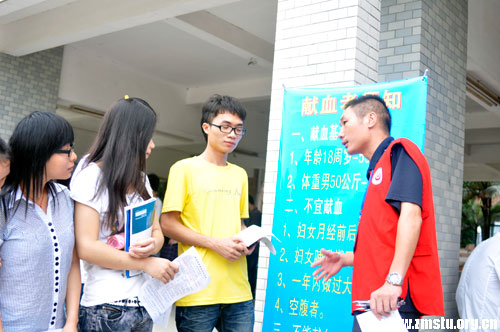 现场血站的工作人员为我院学生说明献血的注意事项及标准的献血条件