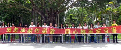 “我们能做的不多,但是我们能做好。我们是学生,我们有我们的方式对震区给予帮助。爱心社全体干事为震区祈福,雅安加油,困难不能压倒我们,全国人民是你们强有力的后盾!”(通讯/成钿 撰稿、摄影/陈洲斯达)