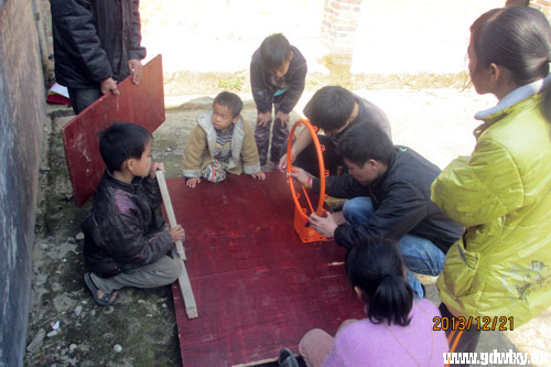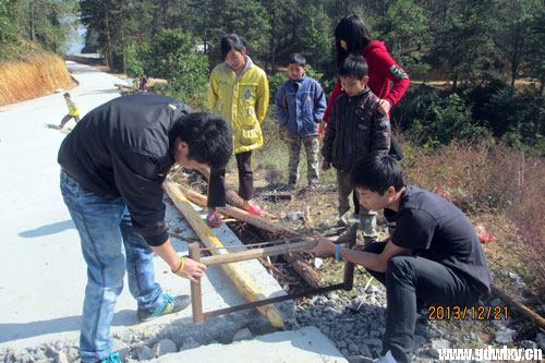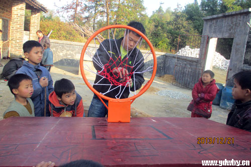 当天,吃过午饭之后,我们立即找来篮球板和篮球架的柱子,用两条合适的杉木做柱子、一块合成夹木板做篮板,量好尺寸,用钉子和锤头将木板固定在两根杉木上面,将多余的木板锯掉,然后用铁杵和铁锹挖凿篮球架立柱的洞穴。挖好洞穴之后,钻洞固定篮球筐在篮板上,固定好篮球筐,就把篮网装上去。整个篮球架完成后,就把简易的篮球架搬到两个洞穴立起来,扶正之后,将洞穴填满踩结实,这样,篮球架做好了。紧接着,我们固定好红旗杆底座的螺丝和红旗杆线条,找到竹竿套好红旗。
