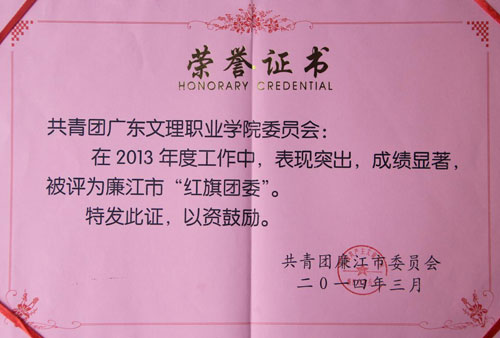 2014年3月,共青团廉江市委员会授予我院团委“红旗团委”荣誉称号,对我院团委2013年度工作给予了高度评价。“红旗称号”以邓小平理论、三个代表重要思想和党的基本路线为指导,贯彻落实团十八大精神,坚持把服务青年作为突破口,以服务促建设,以服务求活跃。