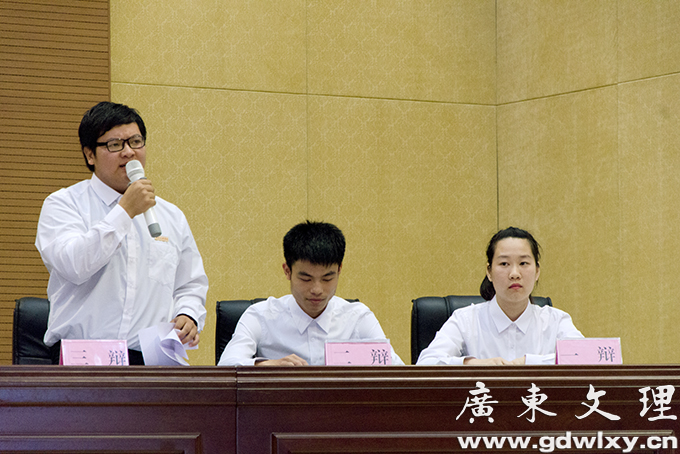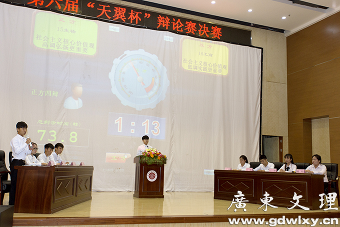 此次大赛在刘春杰书记的精彩致词下拉开序幕。大赛分为冠亚军争夺赛和季军争夺赛两场,共有四支队伍参赛。四支队伍的正、反方分别就环境保护主要靠政府还是群众、高调弘扬社会主义核心价值观还是低调实践更重要这两个辩题展开激烈的论辩。报告厅里响起辩手们慷慨激昂的陈词,双方不分上下。