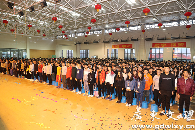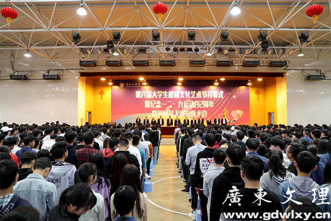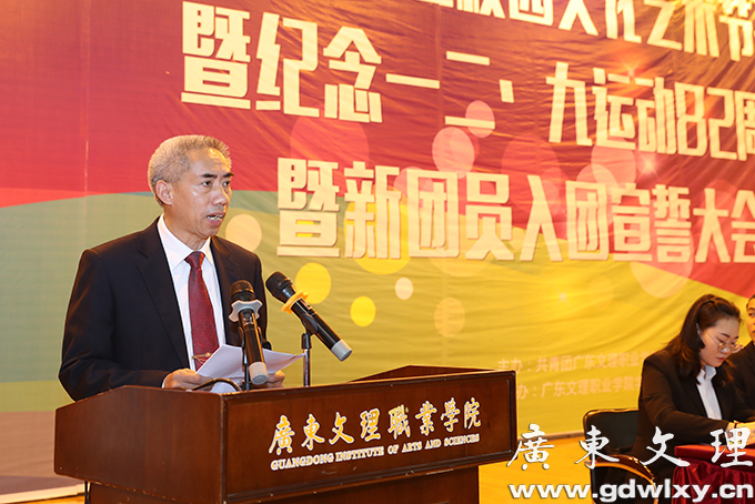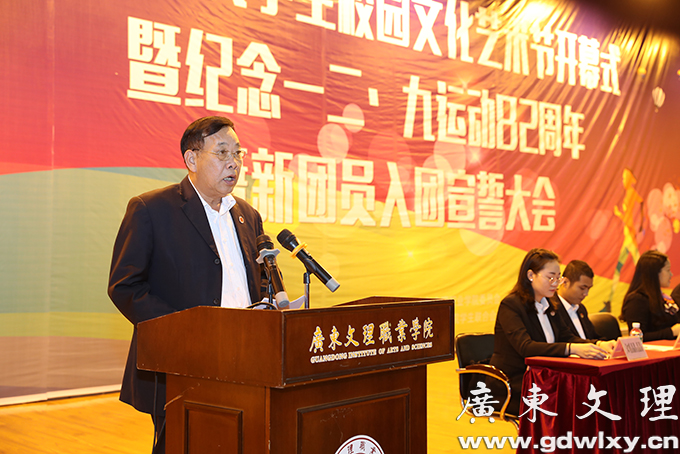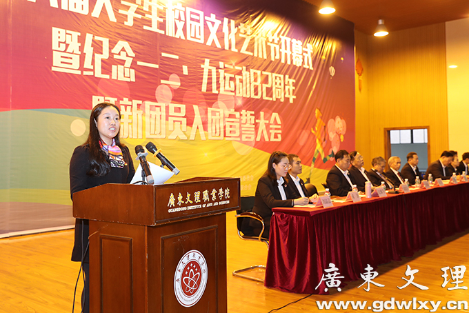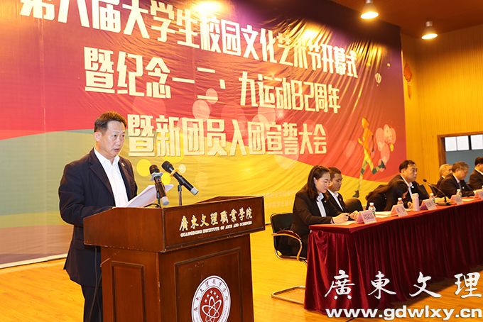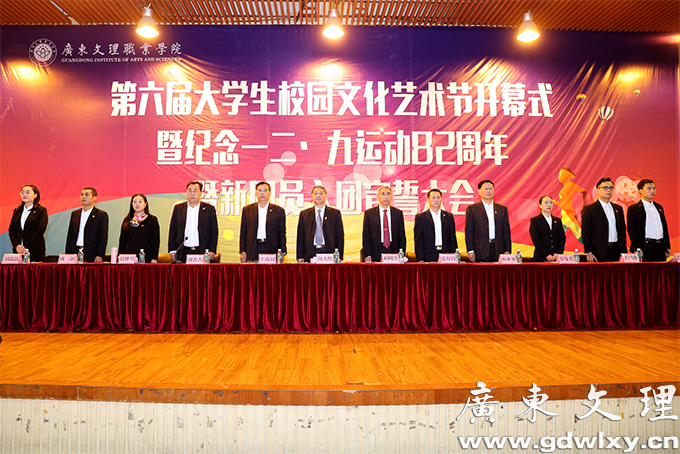 12月7日下午,广东文理职业学院第六届校园文化艺术节在汇珍苑大礼堂举行开幕式。开幕式为新团员举行了入团宣誓仪式和纪念“一二˙九”运动82周年活动。学院党委书记颜大胜,党委副书记、常务副院长刘周堂,副院长王南福出席开幕式并讲话。各党政职能部门、各系(院)部负责人及师生代表、学生干部、全体辅导员参加。开幕式由党委委员、学生处处长、团委书记刘春杰主持。