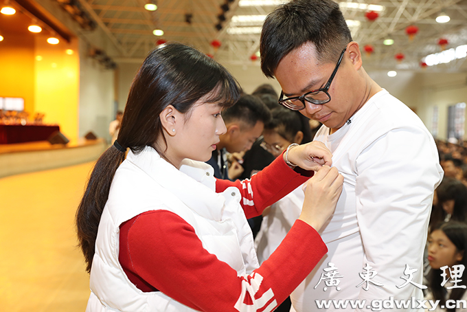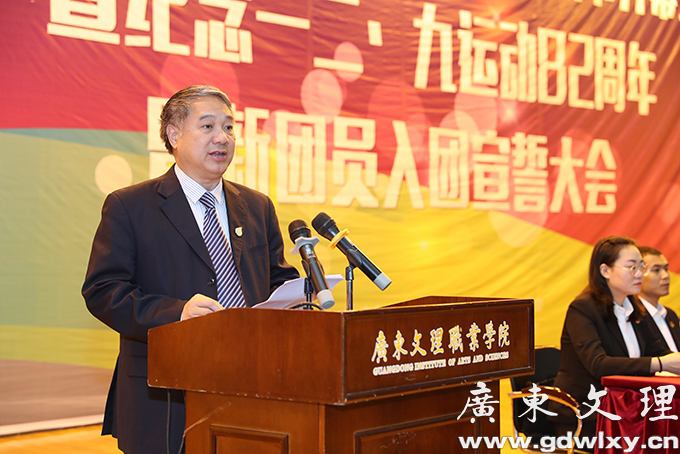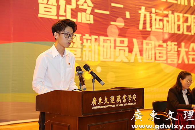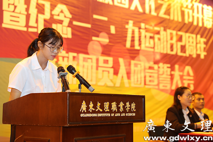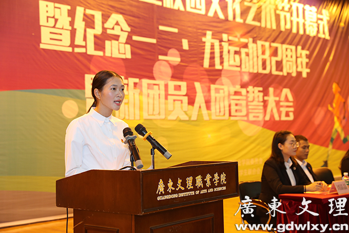 会上,学院党政办公室主任张万新同志宣读《关于发展优秀青年入团的决定》,老团员代表为新团员佩戴团徽,团委组织委员罗发香同志带领新团员进行宣誓,老团员代表刘琦斌同学发言,新团员代表钟洁霞同学发言,学院团委常务副书记赵雅琴同志宣读《关于广东文理职业学院第六届校园文化艺术节活动安排的通知》,学生代表邹炜同学作了发言。