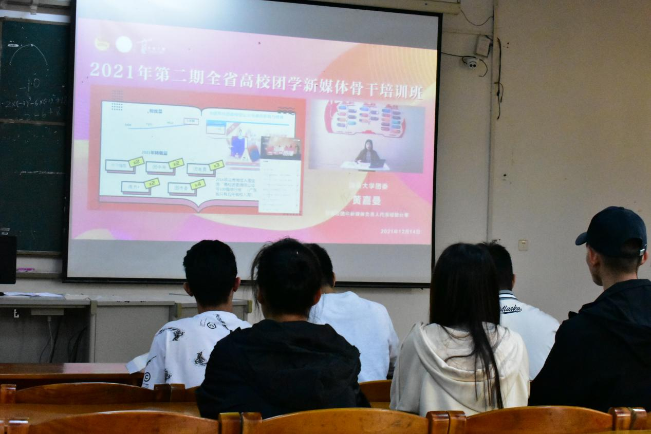 为积极响应团省委、省学联要求,进一步加强我省高校团学组织新媒体建设,根据疫情防控要求,我校于2021年12月14日下午3点,在教学楼A205参加了2021年第二期全省高校团学新媒体骨干线上培训。