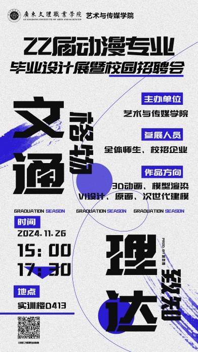 为进一步展示我院动漫专业的教学成果与学生的创新实践能力,同时搭建校企合作平台,拓宽毕业生就业渠道,兹定于2024年11月26日(星期二)下午15:00,在实训楼D413举办第22届动漫专业毕业设计展暨校园招聘会。现将有关事项通知如下: