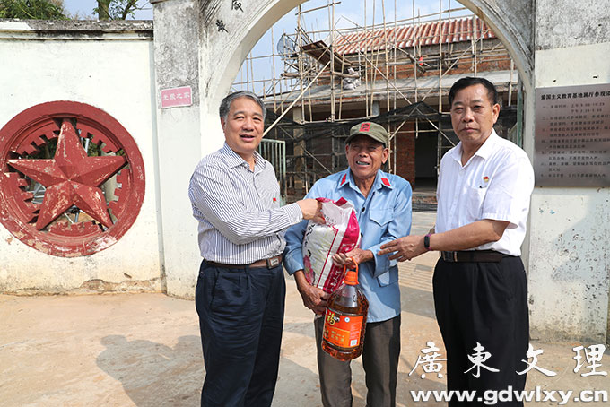 学院党委书记颜大胜(左一)给黄学增烈士后人送上慰问品