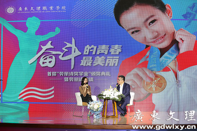 颁奖典礼第一个环节访谈节目——《奋斗的青春最美丽》。劳丽诗接受湛江广播电视台节目主持人古峰先生的访谈。与同学们围绕自己成长历程以及创新创业、大学生发展等主题进行深入交流。在与奥运冠军的近距离互动中,“劳丽诗精神”深深地鼓舞着大家,同学们表示,今后要积极弘扬奥运精神,努力学习,刻苦拼搏,勇于尝试,不断挑战创新,释放青春能量,争做时代青年。