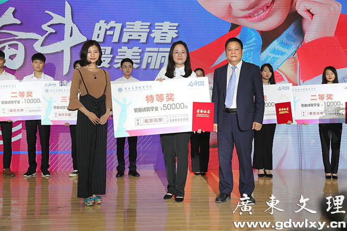 颁奖典礼上,劳丽诗为获奖大学生颁发奖状和奖金。十三名经个人申请、组织推荐的优秀学生分别获得学院首届劳丽诗奖学金特等奖以及一、二、三等奖。其中,特等奖奖金高达五万元。他们中有的因参加全国职业院校技能大赛以及各类学科竞赛获奖为学校争光,有的出国留学、游学获得佳绩为国争光,有的参加各类创新创业活动并获得优秀成果等。