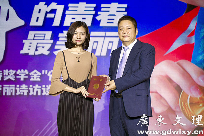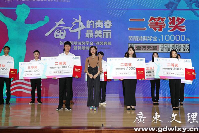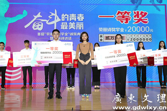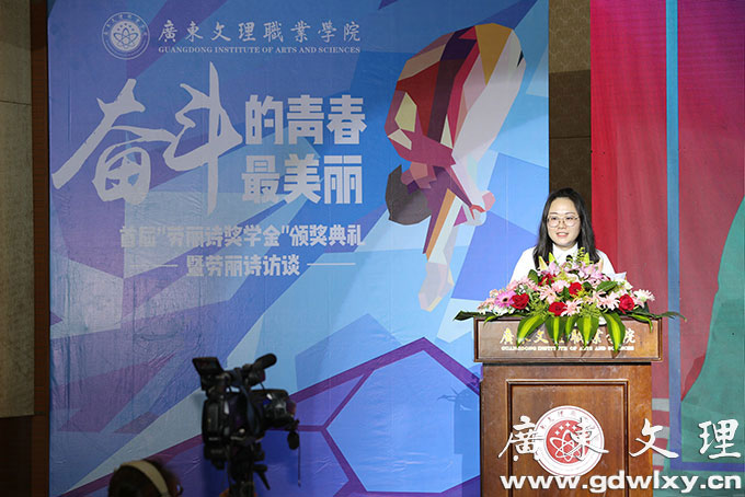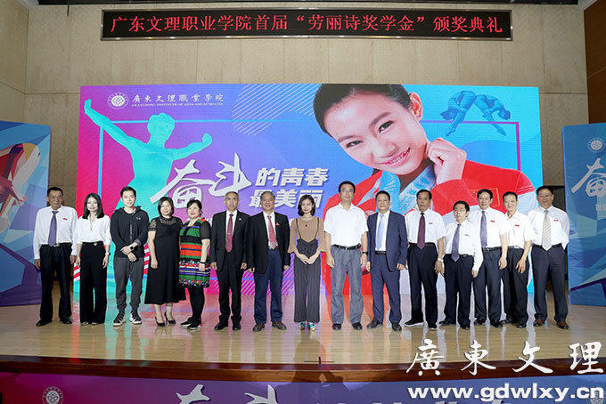 4月24日晚,广东文理职业学院举行首届“劳丽诗奖学金”颁奖典礼,雅典奥运会跳水冠军劳丽诗出席颁奖典礼,并亲自为十三位获奖同学颁奖。廉江市人民政府副市长崔军、学院董事长宣承志出席颁奖典礼并发表讲话。