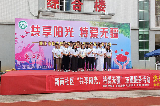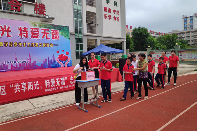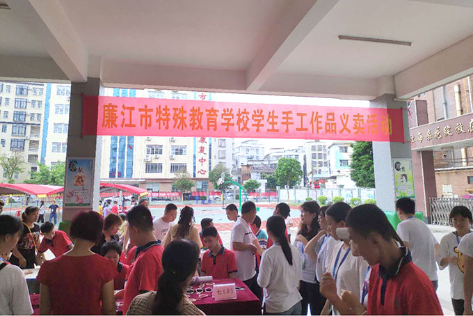 2019年5月29日上午,在“六一”儿童节来临之际,生物工程系青年志愿者团队带着对特殊孩子们的关爱之心,来到了廉江市特殊教育学校,为学校举办的学生手工作品义卖活动。