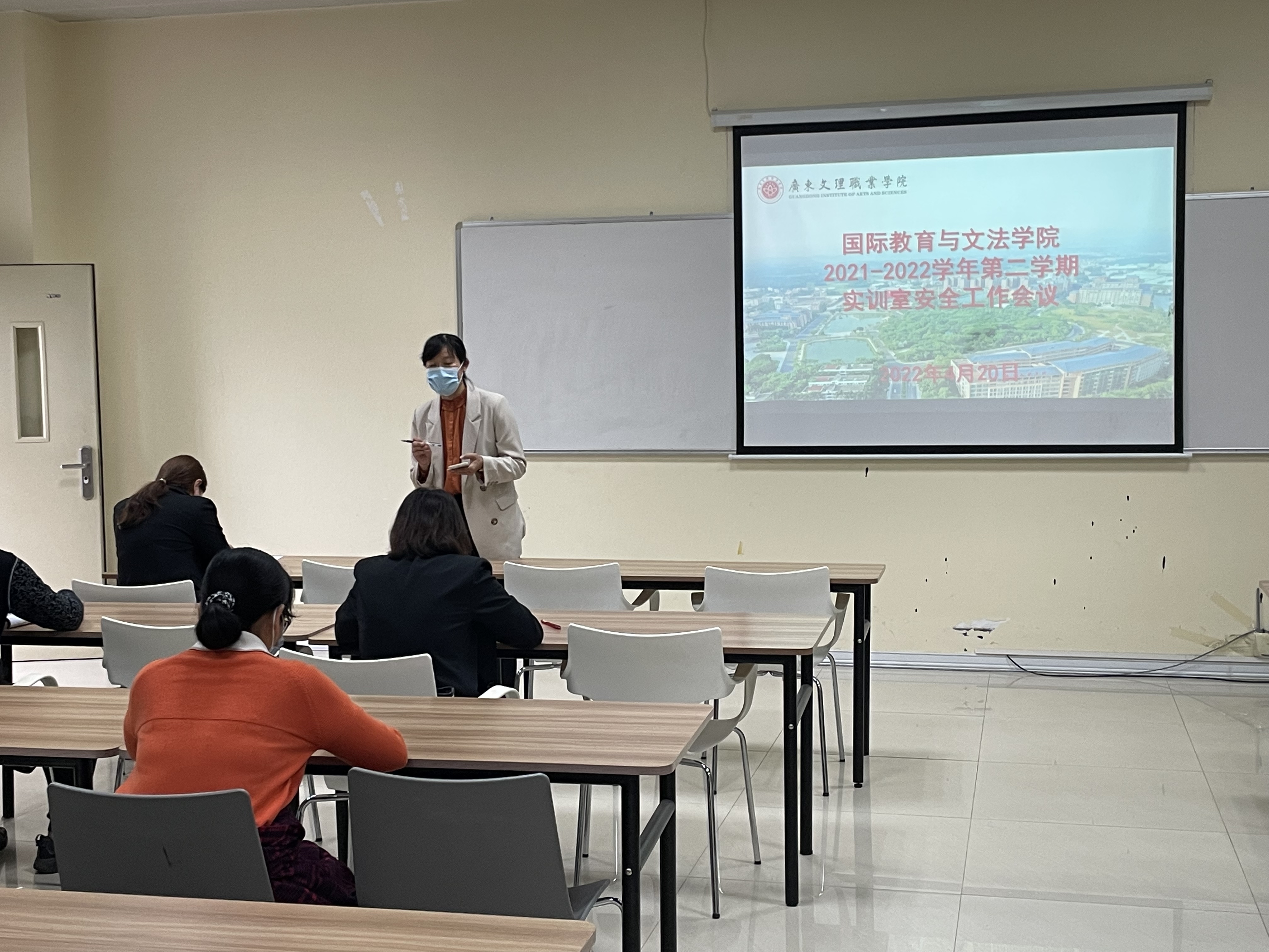 “安全责任重于泰山”,为进一步做好国际教育与文法学院实训安全工作,切实增强各教学实训室实训安全责任感和使命感,4月20日周三下午17时,学院主抓实训工作的副院长王艳芬同志组织实训室各负责人及各实训室管理员在实训楼十楼A1006教室召开实训室安全培训工作专题会议。