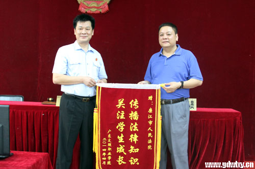 模拟庭审活动结束后,学院董事长宣承志代表学院向廉江市人民法院院长李建强赠送了锦旗。