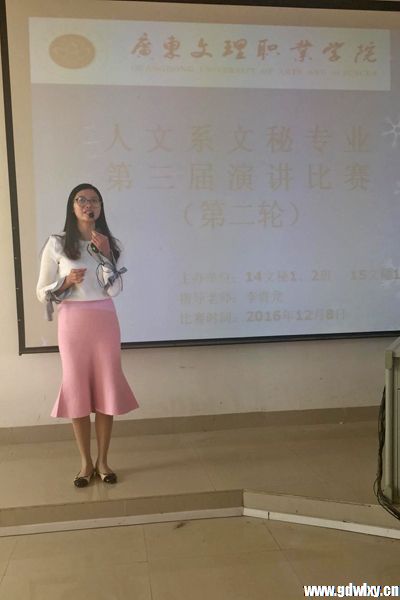 12月8日上午,人文系文秘专业第三届演讲比赛第二轮在第一教学楼A504教室展开角逐。文秘专业教师邓香宁应邀出席,与指导老师李贵龙共同担任评委。大赛主持人依然是由王小红、谢春露担任。