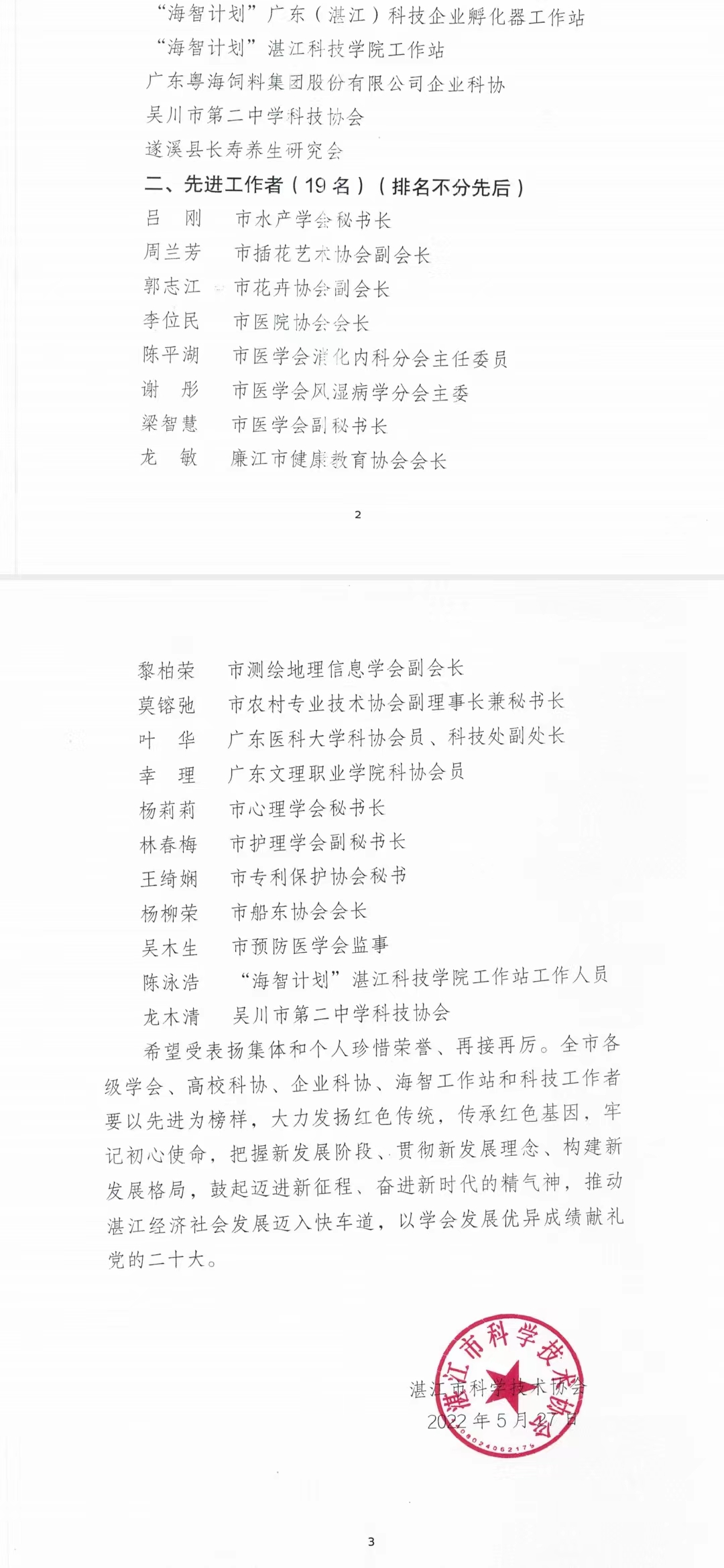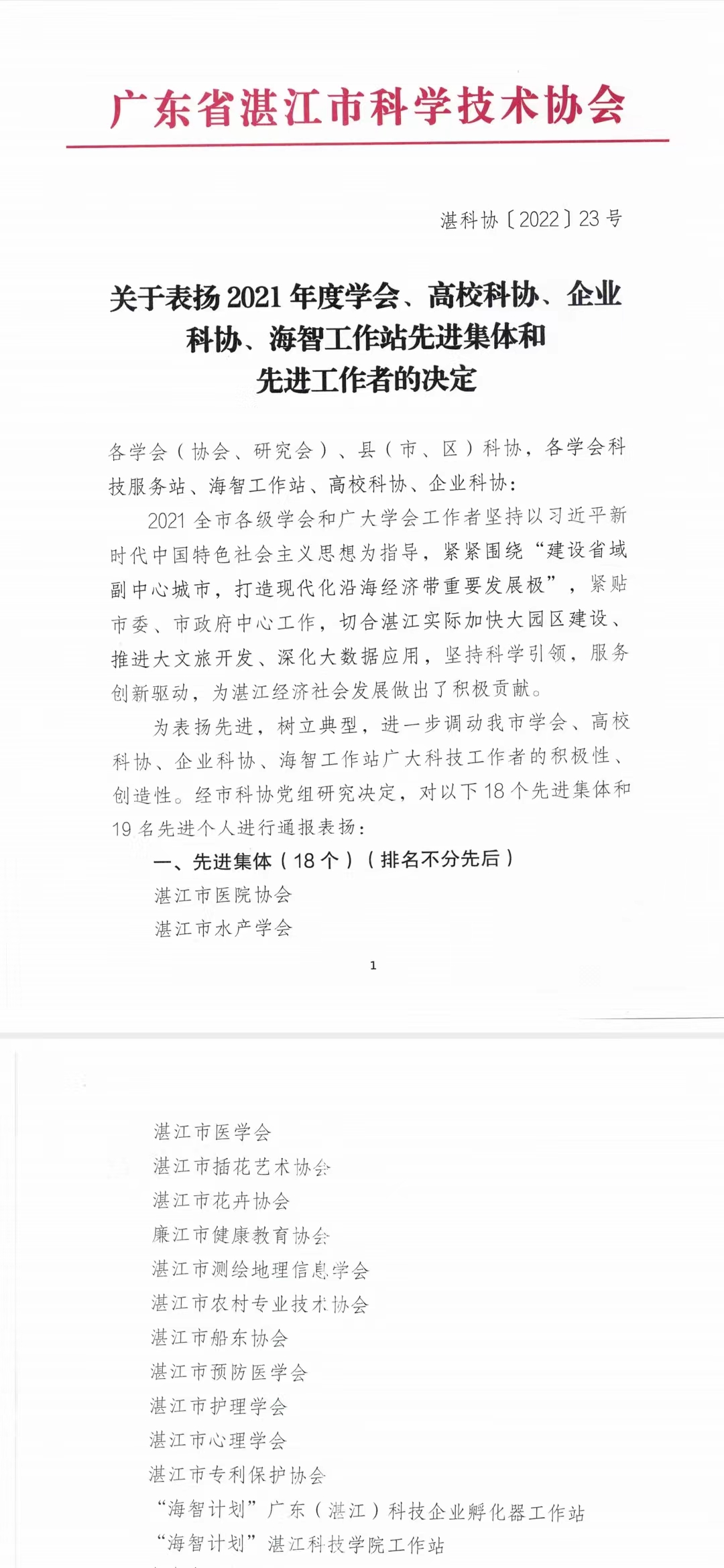 近日,湛江市科学技术协会发布(湛科协[2022]23号)文件,决定表彰2021年度学会、高校科协、企业科协、海智工作站先进集体和先进工作者,我院院长幸理教授受表彰,被评为先进工作者。
