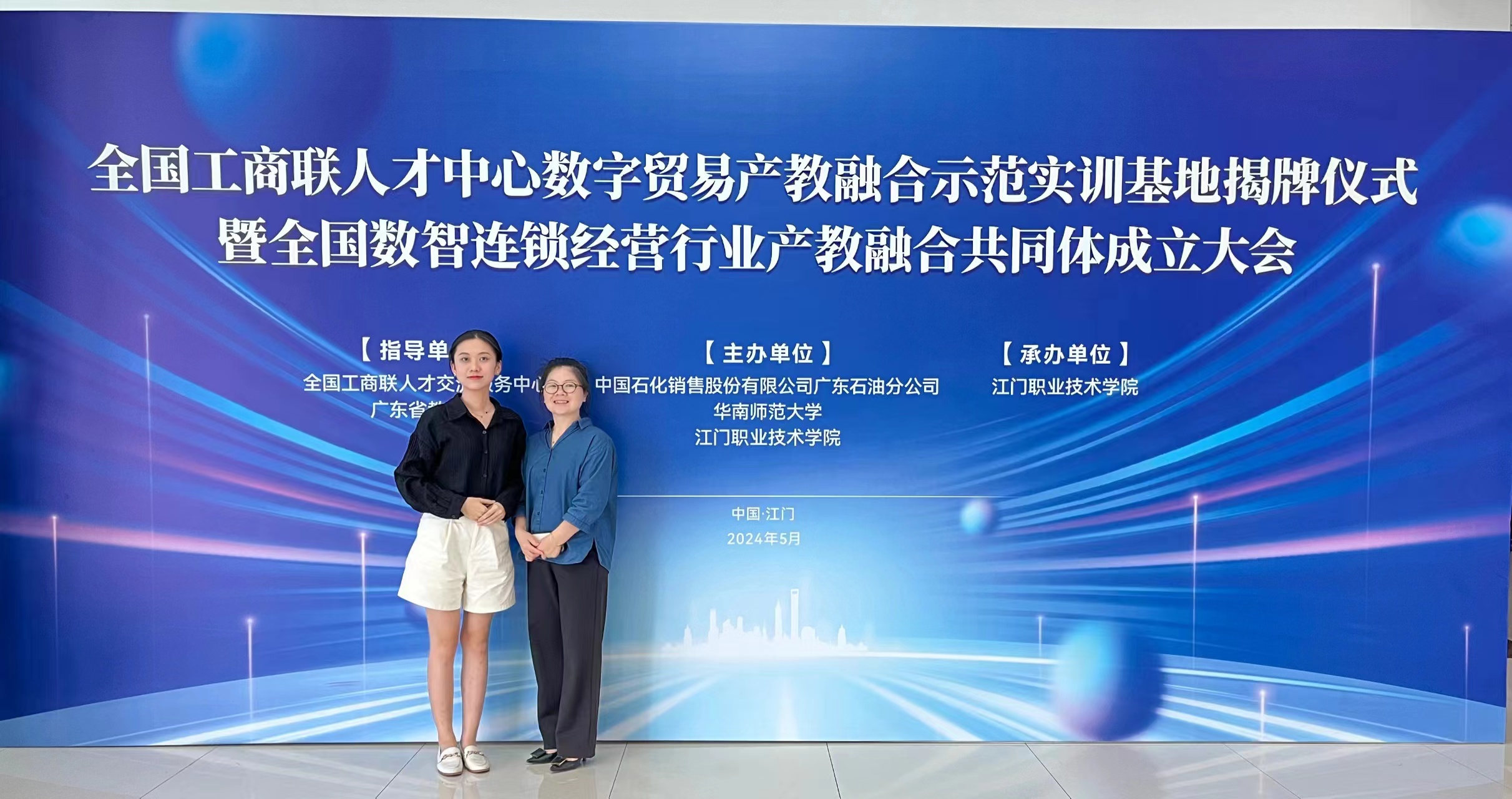 2024年5月17日,为顺应全球化和信息技术革命背景下数智连锁行业的变革,全国工商联人才中心数字贸易产教融合示范实训基地揭牌仪式暨全国数智连锁经营行业产教融合共同体成立大会在江门职业技术学院召开。政府有关部门领导、三十余所高校及二十余所企业代表出席本次会议。经济与管理学院院长助理、现代物流管理专业负责人罗妙巧,酒店管理与数字化运营专业负责人廖芊芊作为学校代表受邀出席。