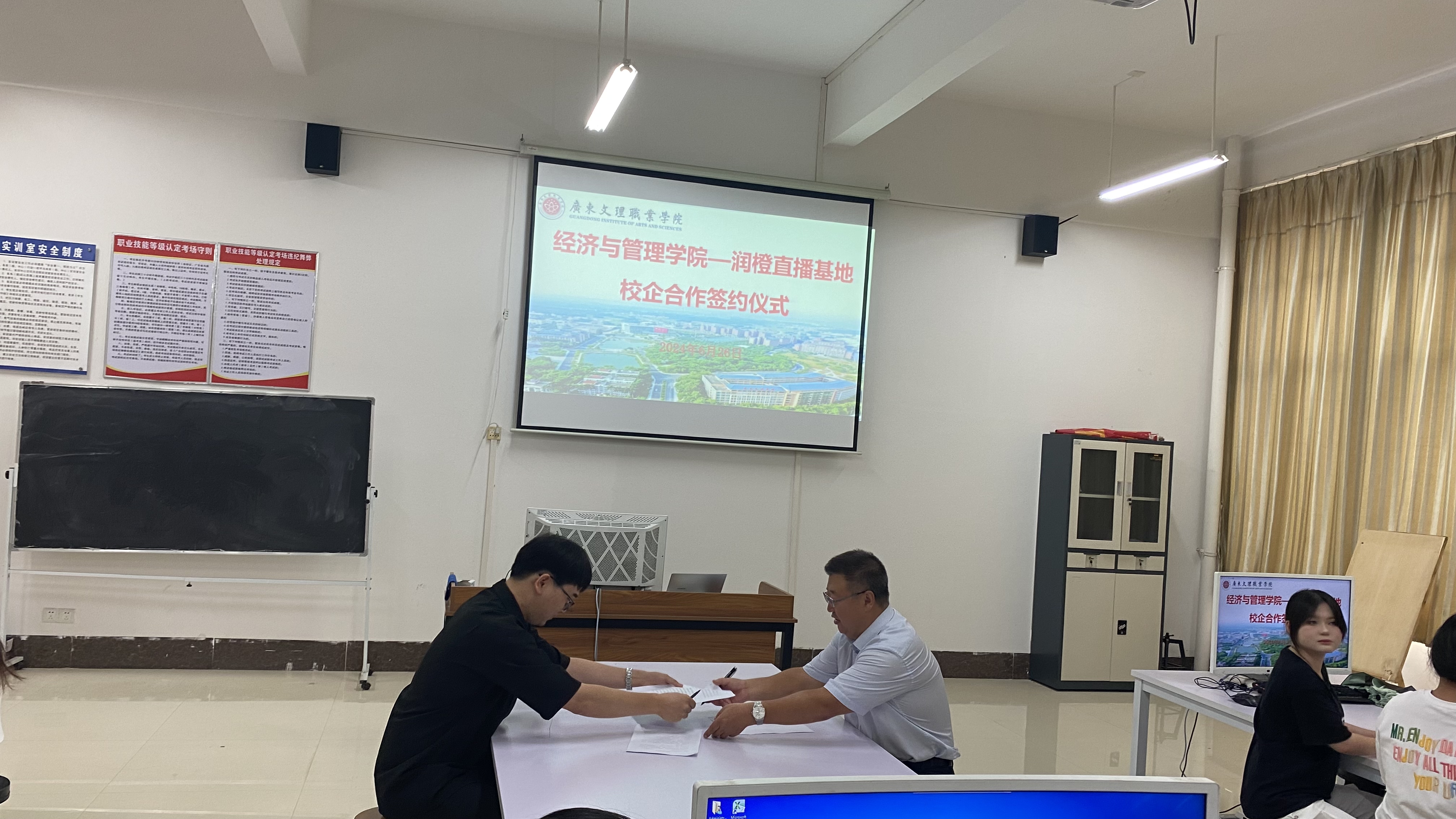 2024年6月26日下午三点,经济与管理学院和廉江润橙直播基地在科技大楼A516营销实训室开展校企合作签约仪式,为学院与企业的深度合作开启了新篇章。