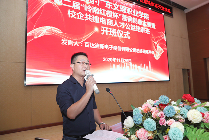 陈寿杰总经理对碧桂园集团、广东省国强公益基金会及广东文理学院对本次培训班的支持和帮助表示感谢。他指出,此项目旨在进一步贯彻落实党中央脱贫攻坚的战略部署,推动广东省电商人才工程的顺利实施。在项目运行中,东莞市百达连新电子商务有限公司将派遣专业导师授课,传授电商相关的平台运营、自媒体、短视频等知识,让同学们可以通过电商渠道实现就业创富,助推国家脱贫攻坚奔小康的步伐。