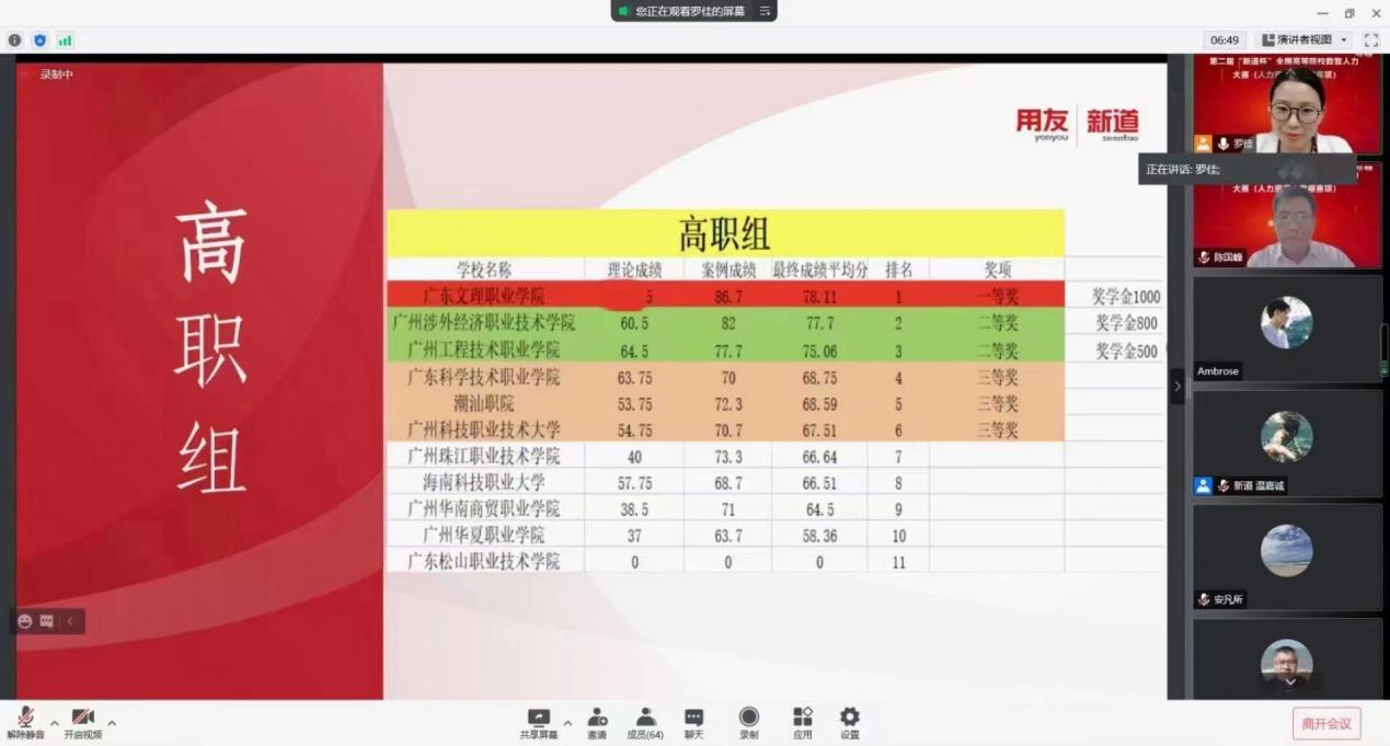 广东文理职业学院经济与管理学院20级人力资源管理专业的“文祥理杰队”(队长:张博能,队员:雷 杰、吴锦祥、冯 宏)代表学校参赛,指导老师为经济与管理学院庞浩然老师,比赛咨询为钟 凯、徐延君老师,全体选手经过顽强拼搏,获得此次大赛一等奖(高职组第一名)的好成绩并成功晋级国赛。