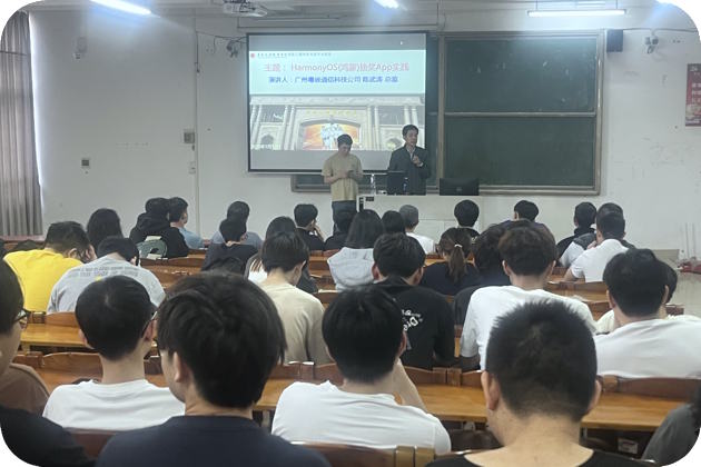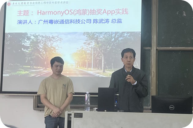 3月12日下午,一个春光明媚的日子,信息工程学院邀请到广州粤嵌通信科技股份有限公司(以下简称粤嵌公司)的陈武涛总监,来我院进行“2025粤嵌&广东文理职业技术学院企业项目进课堂协同育人项目”的讲座,项目内容是“HarmonyOS(鸿蒙)抽奖App实践”。会议由院长铁新城主持,参加会议的有粤嵌公司陈武涛总监带队的宣讲团、信息工程学院的教师和辅导员以及信息工程学院23级的学生。
