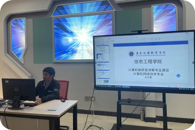 信息通信教研室的赖名廉主任首先发言,针对于物联网技术和移动通信技术两个专业的建设,赖主任从行业趋势和国家政策支持两个方面谈了专业建设的背景,明确了专业定位与专业培养的目标,同时也介绍了专业课程体系与教学特色、师资队伍建设、教学条件与实训基地、校企合作、教学成果与学生发展以及未来发展规划等几个方面的内容。