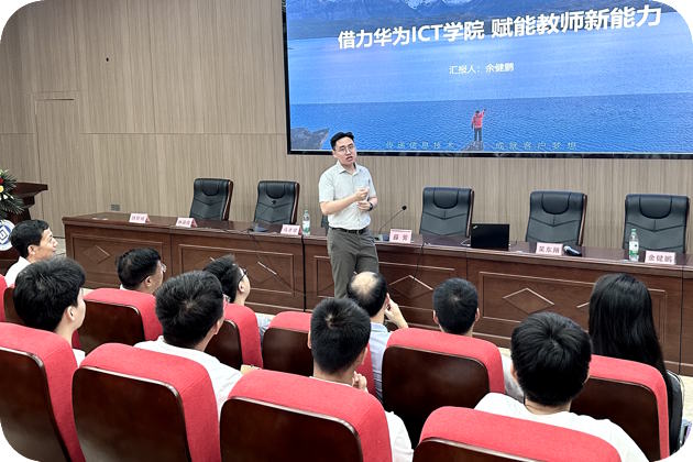 在认证报告会结束后,讯方公司余健鹏经理和吴东翔副院长又不辞辛苦,与信息工程学院的教师们进行了座谈。余经理报告的题目是:“借力华为ICT学院 赋能教师新能力”。余经理从介绍华为ICT学院入手,介绍了华为ICT学院的政策、认证标准,目标与实施方式。余经理指出:华为ICT学院能够助力教师提升专业教学能力、创新教学模式、培养双师型讲师、引领学生参加大赛、打造产教融合典型案例等多个方面,希望教师们积极参与到华为ICT学院的建设活动中。