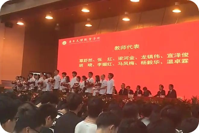 随后,学生给教师代表献花,表达对学校及教师们辛勤培育的感谢。教师代表中,我院龙镇伟和梁河金两位老师也在列。