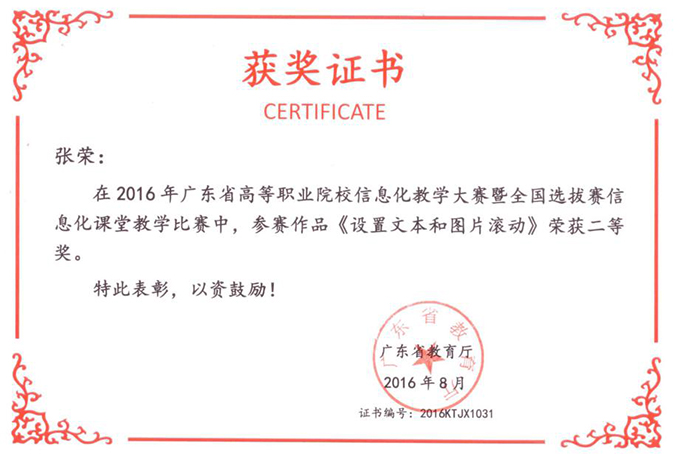 2016年8月,我系张荣老师在广东省高等职业院校信息化教学大赛暨全国选拔信息化课堂教学比赛中,荣获二等奖。