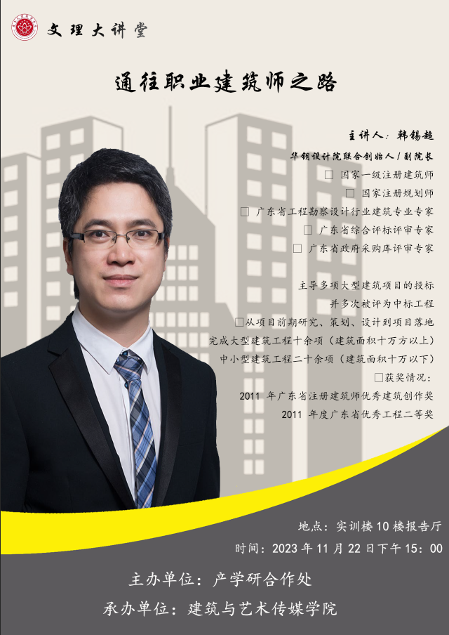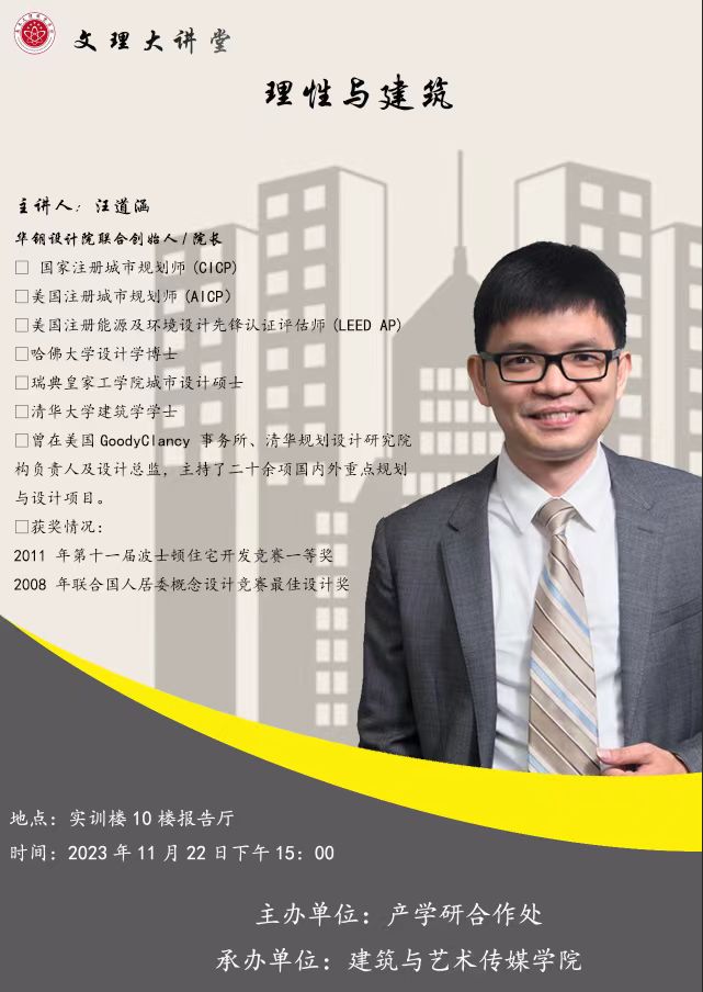 2023年11月22日下午,建筑与艺术传媒学院在学术报告厅举办了一场主题为“理性与建筑”的学术讲座活动。学术讲座由建设与艺术传媒学院院长马才学教授主持。为丰富学生校园文化生活,增长专业知识,提高专业素养,本次学术活动特别邀请了国家注册城市规划师汪道涵博士和国家一级注册建筑师韩锡超博士主讲。