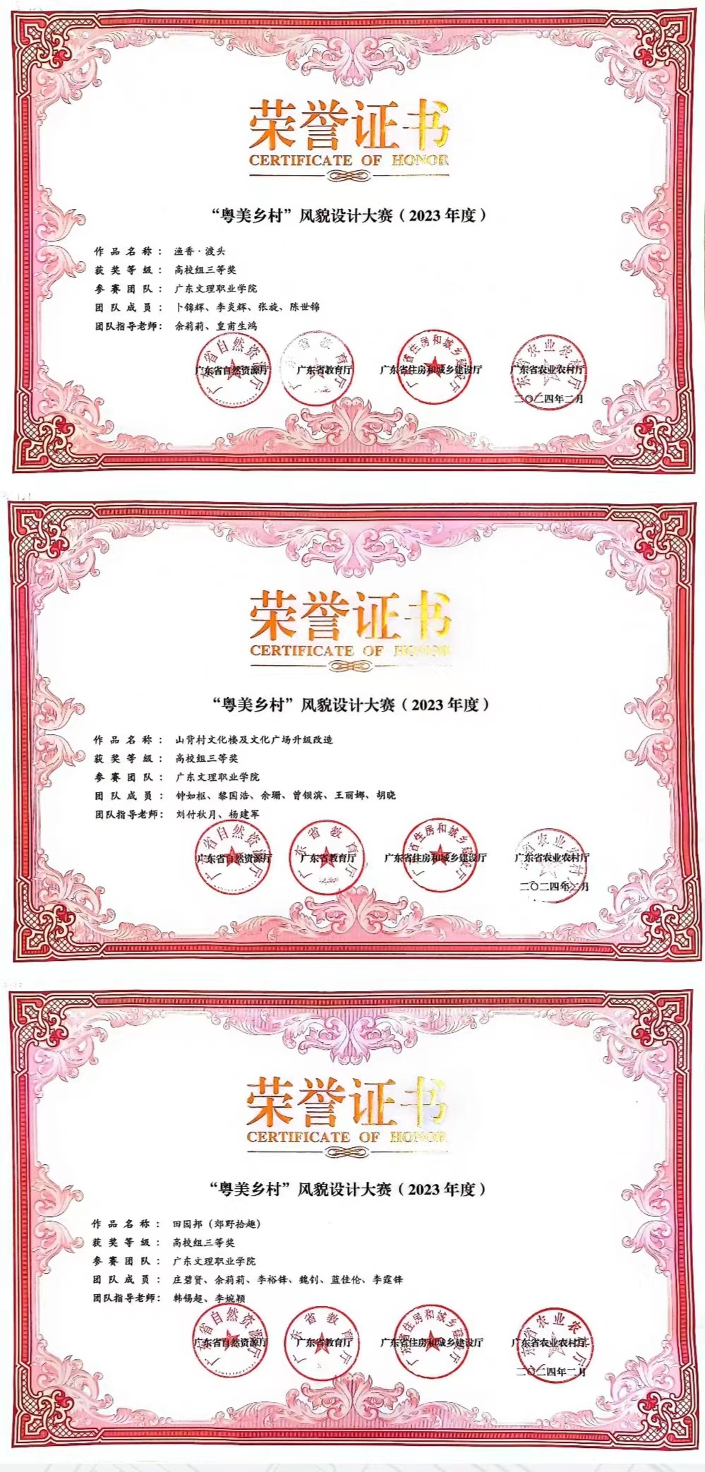 学生李炎辉、张旋、陈世锦在教师余莉莉、皇甫生鸿、卜锦辉的指导下荣获“粤美乡村”风貌设计大赛高校组三等奖;