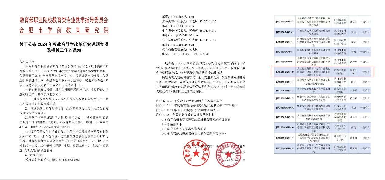 近日,教育部职业院校教育类专业教学指导委员会发布了《关于公布2024年度教育教学改革研究课题立项及相关工作的通知》,公布立项课题158项,我院皇甫生鸿老师申报的《人工智能背景下“金课”建设实践探索-以公共基础课《建筑艺术赏析》为例》课题顺利立项。