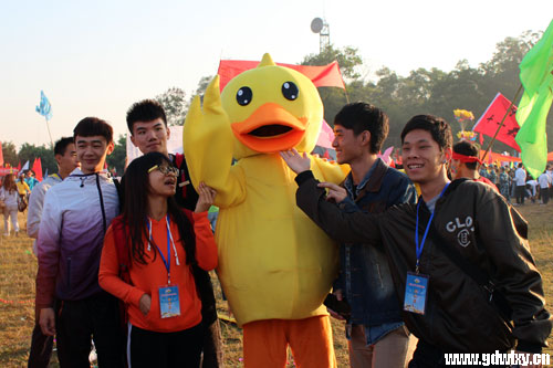 同学们纷纷与“大黄鸭”合影留念